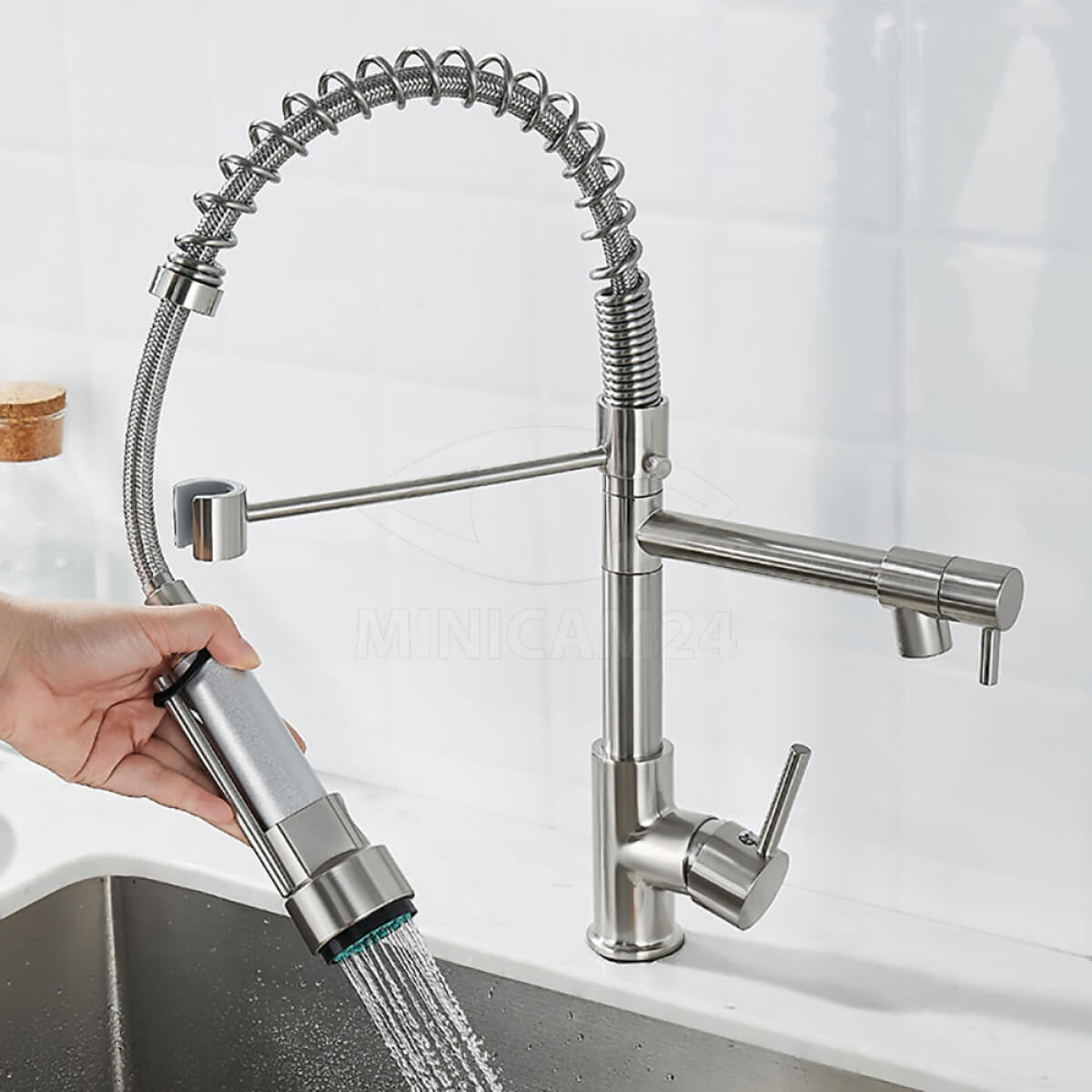 Гибкий смеситель для кухни с выдвижным изливом Mers TH668 для воды выполнен из металла в современном стиле. Смеситель для раковины управляется при помощи рычагов и нажима на управляющие элементы, которые не требуют особых усилий для переключения в нужный режим. Кухонный однорычажный смеситель имеет гибкую основу, за счет которой кран можно поворачивать в любом направлении для мытья овощей, очистки посуды, наполнения емкостей водой. Для фиксации подвижного крана в нормальном положении есть специальная стойка. Водяной кран для мойки с аэратором не боится ржавчины, загрязнений, царапин и механических повреждений за счет качественного покрытия.
